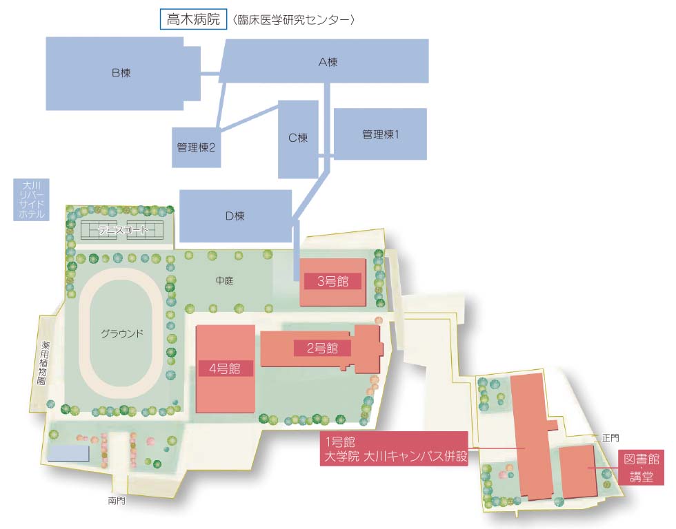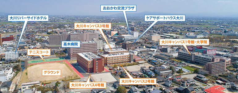 大川キャンパスは、隣接する高木病院をはじめ、さまざまなグループ施設と一体化。医療福祉を学ぶ最適な環境が整っています。