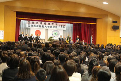 校歌斉唱から始まり、大友邦学長、三浦総一郎大学院長、高木邦格理事長の式辞と続き、新入生を代表して作業療法学科の中島来夢さんが「大学での新生活に期待と不安で胸がいっぱいです。楽しいことばかりではなく、多くの壁にぶつかることもあると思いますが、国際医療福祉大学の一員としての自覚と誇りを持ち、乗り越えて行きます」と、誓いの言葉を述べました。