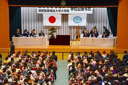 春の訪れを感じる澄みきった天候の下、3月11日(月)に福岡国際医療福祉学院体育館にて「平成30年度福岡保健医療学部・福岡看護学部・大学院合同学位記授与式」を行いました。