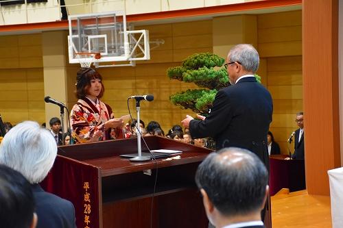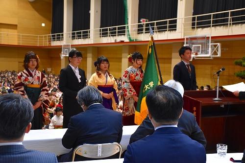 その後、大友学長、三浦大学院長、高木邦格理事長の式辞と続き、卒業生を代表して看護学科の野村綾音さんが「看護師として人の命に携わっていく事への責任の重さ・役割を強く心に感じ、この思いを忘れずにこれから看護師として患者さんと向き合っていきたい」と、こころに残る謝辞を述べました。