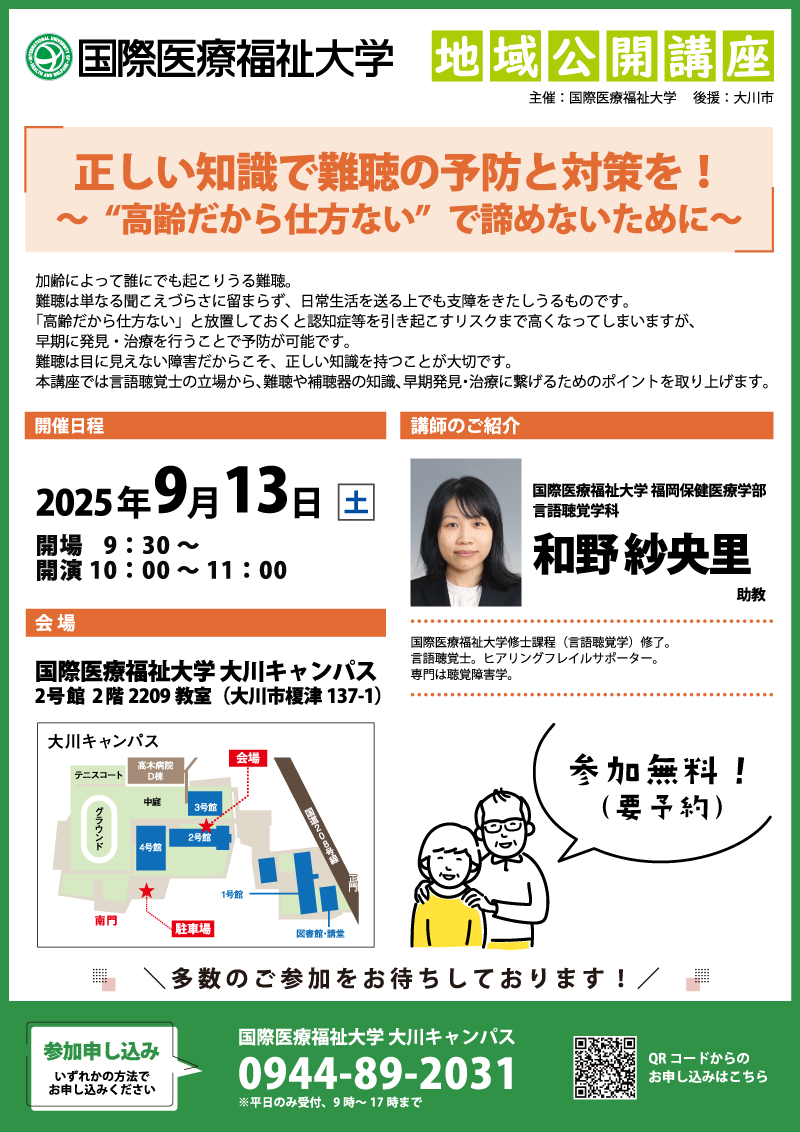 9/13(土)地域公開講座「正しい知識で難聴の予防と対策を!〜"高齢だから仕方ない"で諦めないために〜」を開催いたします