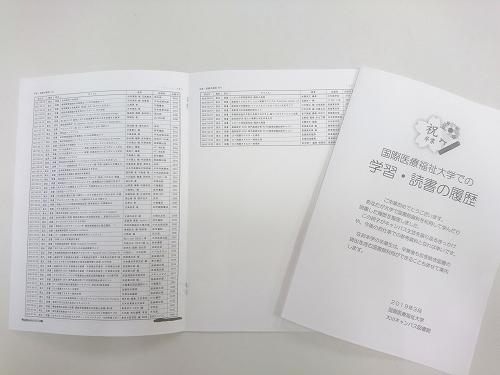 大川キャンパスの図書館では、卒業を目前にした2月下旬、学生が4年間で図書館から借りた書籍の一覧を冊子にし、希望者に配付しました。冊子をみれば、学年が進むにつれて専門的な内容を勉強するようになったり、国家試験対策に力をいれていくようになった様子がよくわかります。図書館のスタッフ全員で手作りしたこの冊子は、キャンパスでの4年間の学修を振り返るのに最適で、多くの学生から希望があり、好評でした。
