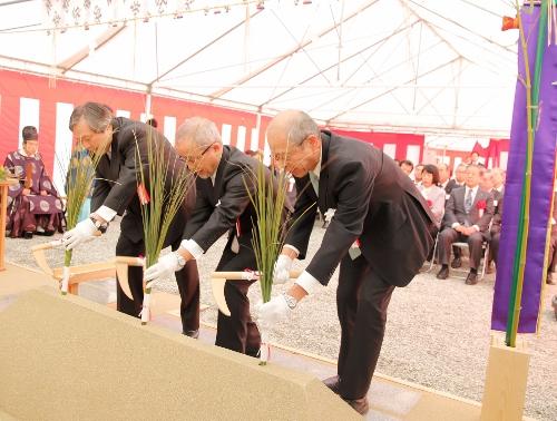 起工式には高木邦格理事長、大友邦学長、外須美夫副学長ら大学関係者と来賓として倉重良一大川市長、川野栄美子大川市議会議長、津村洋一郎大川商工会議所会頭など約60人が出席。