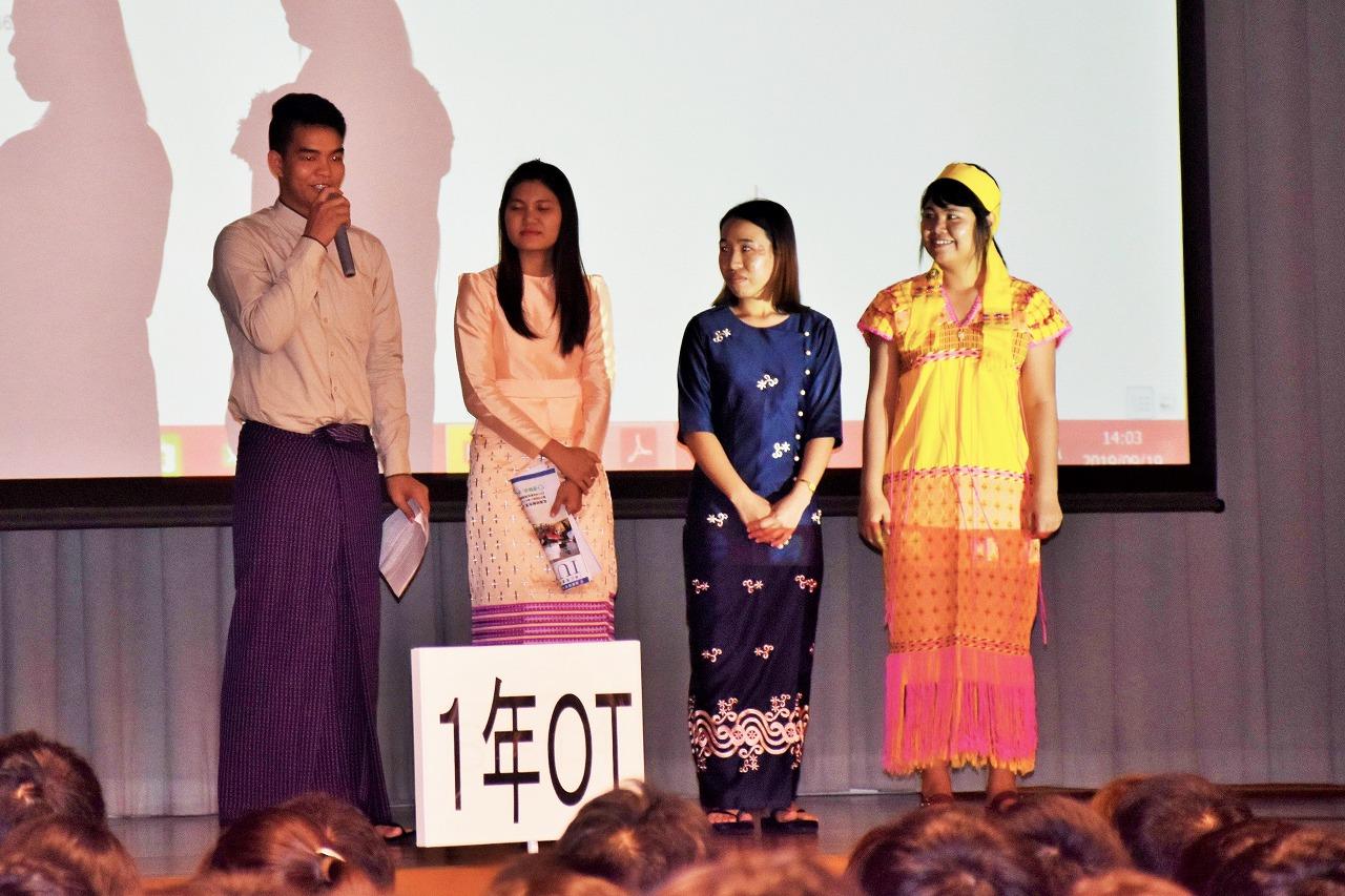 成果報告会のミャンマー班の発表では、現在大川キャンパス留学生別科に所属するミャンマー人留学生によるミャンマーの文化紹介があり、鮮やかな民族衣装に会場が沸きました。