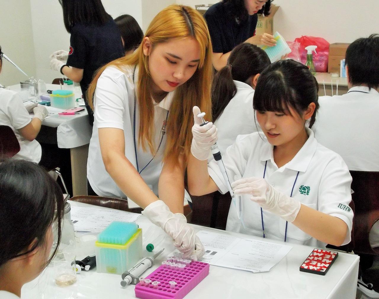 【韓国 テグハニ大学】韓国テグハニ大学研修には医学検査学科の学生が多く参加しました。写真は先方学生のサポートを受けながら、ウィルス検査の実習をしている様子です。