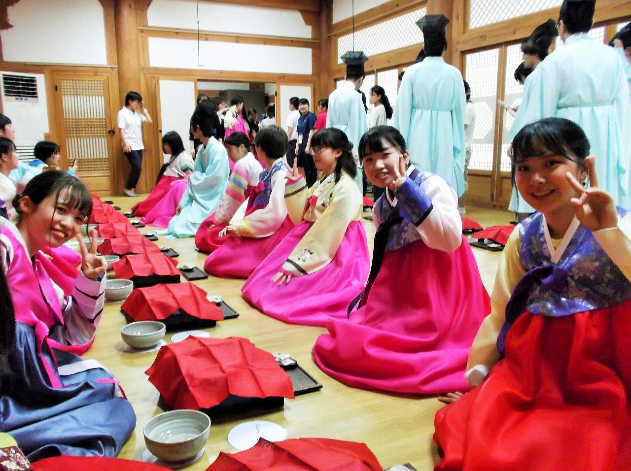 【韓国 テグハニ大学】大学構内にある「韓学村」で、韓国の民族衣装の試着と韓国式の茶道を体験しました。