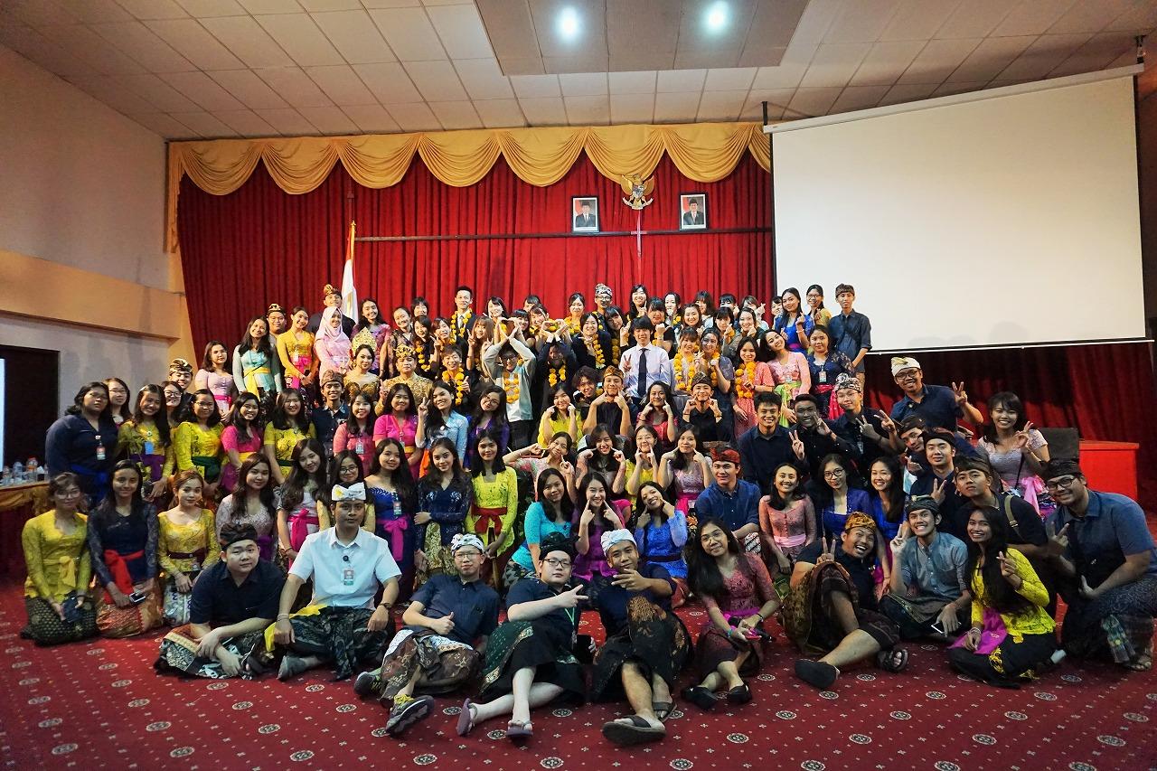 【インドネシア】研修先のウダヤナ大学で開かれたウェルカムパーティは参加者総勢80名超。先方学生はインドネシアでは正装にあたる民族衣装で参加してくれました。