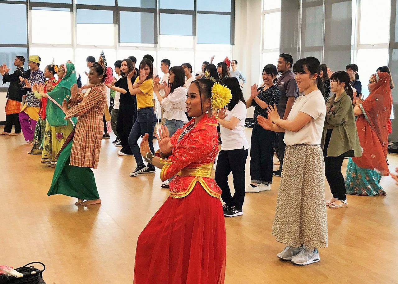 【マレーシア】受入れ先のマネジメント&サイエンス大学(MSU)の学生が、マレーシアの民族舞踊を実演し、指導してくれました。初めのうちは硬さも見られましたが、指導者の動きに引き込まれるように学生全員が踊りに積極的に参加していました。