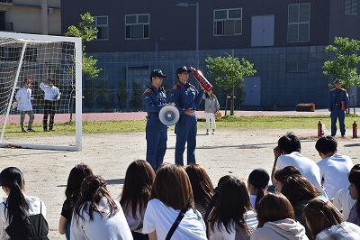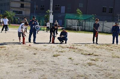 今年度は、教室で火災が発生したという想定で訓練を行いました。訓練では、火災報知器の発報と同時に、教職員で組織する自衛消防隊が火元を確認、初期消火を試みるも、消火不能と判断されると、学生261名と教職員がグラウンドへと避難しました。 全員の無事を確認し、避難完了の後、訓練用消火器で操作方法や使用する際の注意点について説明を受け、代表学生数名による実技訓練を実施しました。