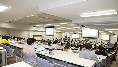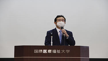 今春開設した福岡薬学部では、少し緊張した面持ちの薬学科の1年生を前に、外須美夫副学長・高木病院長が、「2カ月遅れて、皆さんをこのキャンパスに迎えることができました。マスク越しにではありますが、皆さんの期待と希望を直に感じることができます。コロナ感染症に打ち勝つにはワクチンを含め抗ウイルス薬など、薬の力が不可欠です。薬のエキスパートになる皆さんもしっかり勉強して世界の人に良い薬を提供してください。クラスメートや仲間との友情と絆を強めて、人間として成長し、学生生活を実りあるものにしてください」と挨拶。