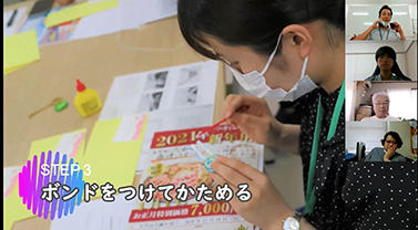 交流会は、グループに分かれて東京オリンピックで話題になったピクトグラムを使った自己紹介でスタート。思わず笑みがこぼれ、自然と会話が繋がり気持ちは一つに。続いて日本文化体験として、日本人学生が水引を紹介しました。その後にサプライズが!日本人学生が作った水引のブックマークとメッセージカードを封筒に入れて未開封のまま留学生に渡していたのです。開封した時の喜んだ顔をみて、作った日本人学生にも笑顔の連鎖反応がおきました。
