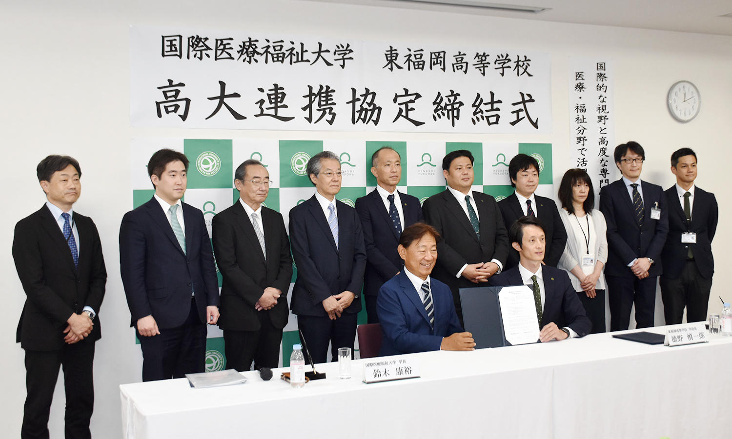国際医療福祉大学と東福岡高等学校(福岡市)は9月4日(木)、大川キャンパスにて、医療福祉分野で活躍する人材の育成に関する高大連携協定を締結しました。相互の教育交流を通じて、高校生たちが将来の進路を選択する中で、医療福祉分野への関心を高めてもらい、併せて国際的な視野と高度な専門性を備えた人材の育成を目指すものです。締結式では、本学の鈴木康裕学長と東福岡高等学校の德野慎一郎学校長が協定書に署名しました。