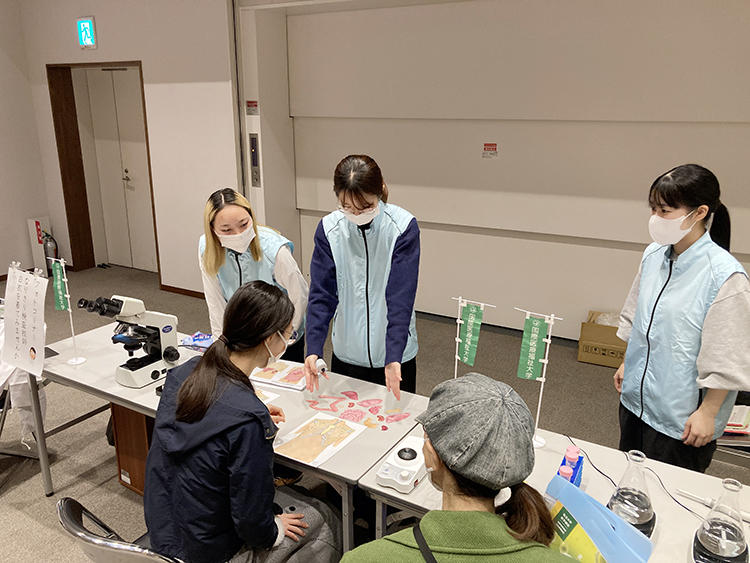 本学のブースでは、医学検査学科2年生4名と1年生2名の協力のもと、「実験器具に触れてみよう」「臓器パズル」「白衣を着てみよう」などのコーナーを設けました。