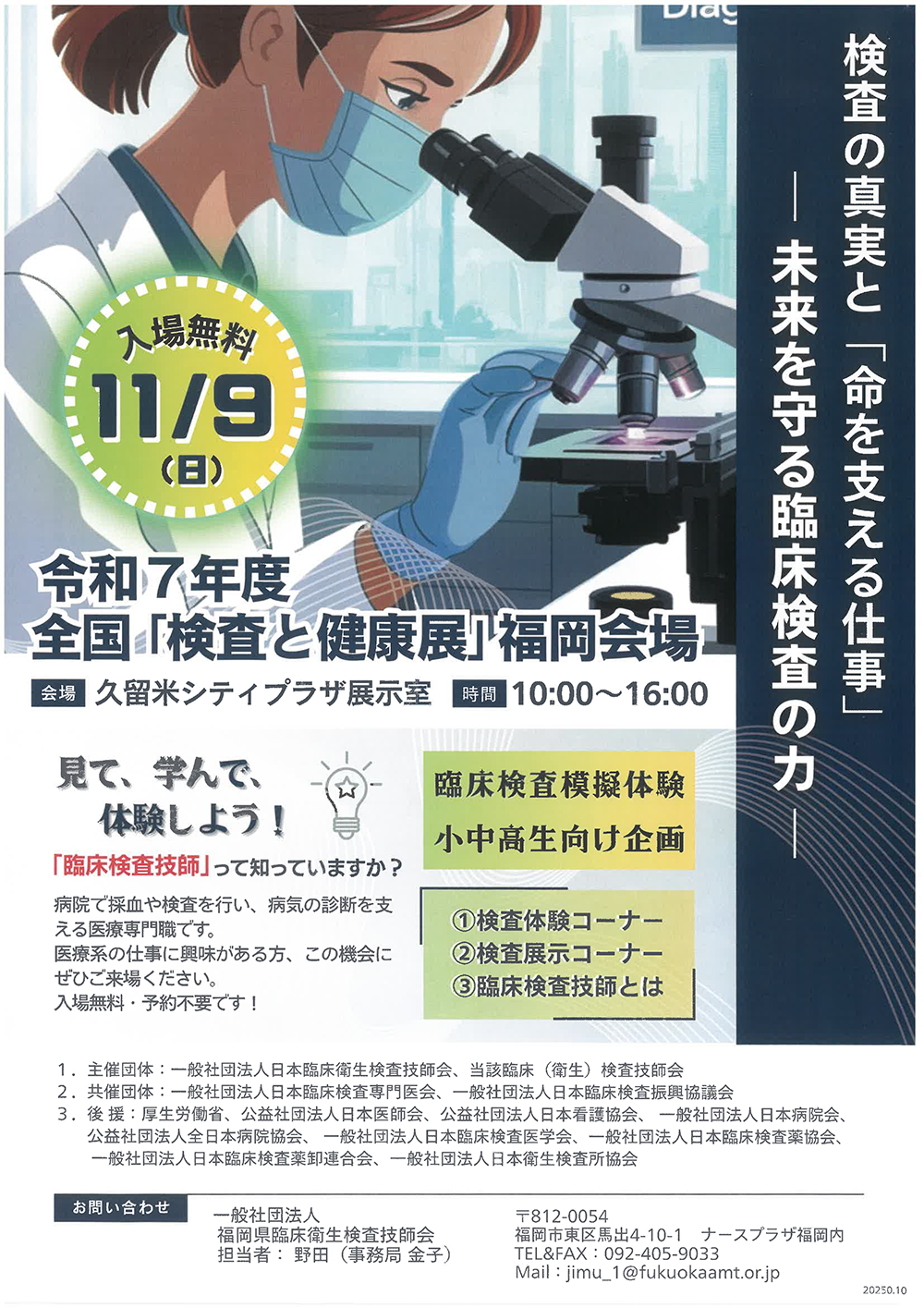 11月9日に久留米シティプラザにて、福岡県臨床衛生検査技師会主催の「検査と健康展」が開催されました。